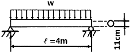 그림과 같이 길이 ℓ=4 m의 단순보에 균일 분포하중 ω가 작용하고 있으며 보의 최대 굽힘응력 σmax=85 N/cm2일 때 최대 전단응력은 약 몇 kPa인가? (단, 보의 단면적은 지름이 11 cm인 원형단면이다.)
