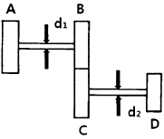 그림과 같은 치차 전동 장치에서 A치차로부터 D치차로 동력을 전달한다. B와 C치 차의 피치원의 직경의 비가 일 때, 두 축의 최대 전단응력들이 같아지게 되는 직경의 비 은 얼마인가?