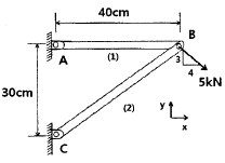 그림과 같은 트러스가 점 B에서 그림과 같은 방향으로 5 kN의 힘을 받을 때 트러스에 저장되는 탄성에너지는 약 몇 kJ인가? (단, 트러스의 단면적은 1.2 cm2, 탄성계수는 106 Pa이다.)