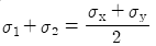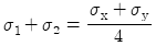 평면 응력상태에 있는 재료 내부에 서로 직각인 두 방향에서 수직 응력 σx, σy가 작용 할 때 생기는 최대 주응력과 최소 주응력을 각각 σ1, σ2 라 하면 다음 중 어느 관계식이 성립하는가?