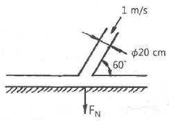 지름 20cm, 속도 1m/s인 물 제트가 그림과 같이 넓은 평판에 60° 경사하여 충돌한다. 분류가 평판에 작용하는 수직방향 힘 FN은 약 몇 N인가? (단, 중력에 대한 영향은 고려하지 않는다.)