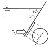 수평면과 60° 기울어진 벽에 지름이 4m인 원형창이 있다. 창의 중심으로부터 5m 높이에 물이 차있을 때 창에 작용하는 합력의 작용점과 원형창의 중심(도심)과의 거리(C)는 약 몇 m인가? (단, 원의 2차 면적 모멘트는 (πR4)/4이고, 여기서 R은 원의 반지름이다.)