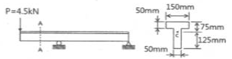 그림과 같이 T형 단면을 갖는 돌출보의 끝에 집중하중 P=4.5 kN이 작용한다. 단면 A-A에서의 최대 전단응력은 약 몇 kPa인가? (단, 보의 단면2차 모멘트는 5313cm4이고, 밑면에서 도심까지의 거리는 125mm이다.)