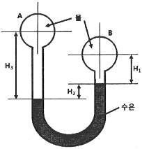 다음 U자관 압력계에서 A와 B의 압력차는 몇 kPa인가? (단, H1=250mm, H2=200mm, H3=600mm이고 수은의 비중은 13,6이다.)