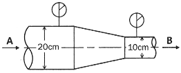 그림에서 입구 A에서 공기의 압력은 3×105Pa, 온도 20℃, 속도 5m/s이다. 그리고 출구 B에서 공기의 압력은 2×105Pa, 온도 20℃이면 출구 B에서의 속도는 몇 m/s인가? (단, 압력 값은 모두 절대압력이며, 공기는 이상기체로 가정한다.)
