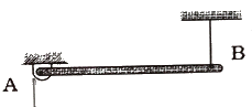 길이가 1m이고 질량이 5kg인 균일한 막대가 그림과 같이 지지되어 있다. A점은 힌지로 되어 있어 B점에 연결된 줄이 갑자기 끊어졌을 때 막대는 자유로이 회전한다. 여기서 막대가 수직 위치에 도달한 순간 각속도는 약 몇 rad/s 인가?