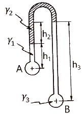 그림과 같은 시차액주계에서 A, B점의 압력차 PA - PB는? (단, γ1, γ2, γ3는 각 액체의 비중량이다.)