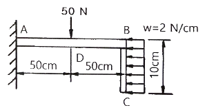 한 쪽을 고정한 L형 보에 그림과 같이 분포하중(w)과 집중하중(50N)이 작용할 때 고정단 A 점에서의 모멘트는 얼마인가?