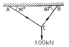 그림과 같이 강선이 천정에 매달려 100kN의 무게를 지탱하고 있을 때, AC 강선이 받고 있는 힘은 약 몇 kN 인가?