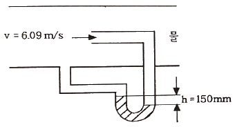 그림과 같은 피토관의 액주계 눈금이 h = 150mm 이고 관속의 물이 6.09 m/s로 흐르고 있다면 액주계 액체의 비중은 얼마인가?