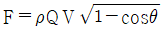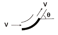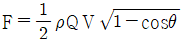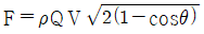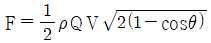 그림과 같이 속도 V인 유체가 곡면에 부딪혀 θ의 각도로 유동방향이 바뀌어 같은 속도로 분출된다. 이때 유체가 곡면에 가하는 힘의 크기를 θ에 대한 함수로 옳게 나타낸 것은? (단, 유동단면적은 일정하고, θ의 각도는 0° ≤ θ ≤ 180° 이내에 있다고 가정한다. 또한 Q는 체적 유량, ρ는 유체밀도이다.)