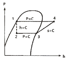 그림과 같은 이상적인 열펌프의 압력(P)-엔탈피(h) 선도에서 각 상태의 엔탈피는 다음과 같을 때 열펌프의 성능계수는? (단, h1 = 155 kJ/kg, h3 = 593 kJ/kg, h4= 827 kJ/kg 이다.)