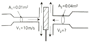 그림과 같이 평판의 왼쪽 면에 단면적이 0.01 m2, 속도 10m/s인 물 제트가 직각으로 충돌하고 있다. 평판의 오른쪽 면에 단면적이 0.04 m2인 물 제트를 쏘아 평판이 정지 상태를 유지하려면 속도 V2 는 약 몇 m/s 여야 하는가?