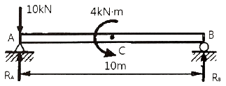 그림과 같이 10kN의 집중하중과 4kN·m의 굽힘모멘트가 작용하는 단순지지보에서 A 이치의 반력 RA는 약 몇 kN 인가? (단, 4kN·m의 모멘트는 보의 중앙에서 작용한다.)