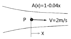 비압축성 유체가 그림과 같이 단면적 A(x)=1-0.04x(m2)로 변화하는 통로 내를 정상상태로 흐를 때 P점(x=0)에서의 가속도(m/s2)는 얼마인가? (단, P점에서의 속도는 2m/s, 단면적은 1m2이며, 각 단면에서 유속은 균일하다고 가정한다.)