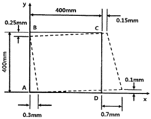 0.4m×0.4m인 정사각형 ABCD를 아래 그림에 나타내었다. 하중을 가한 후의 변형 상태는 점선으로 나타내었다. 이때 A 지점에서 전단 변형률 성분의 평균값(γxy)는?