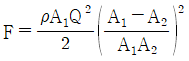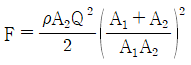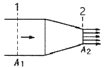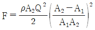 그림과 같은 노즐을 통하여 유량 Q만큼의 유체가 대기로 분출될 때, 노즐에 미치는 유체의 힘 F는? (단, A1, A2는 노즐의 단면 1, 2에서의 단면적이고 ρ는 유체의 밀도이다.)