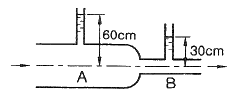 그림과 같이 유리관 A, B 부분의 안지름은 각각 30cm, 10cm 이다. 이 관에 물을 흐르게 하였더니 A에 세운 관에는 물이 60cm, B에 세운 관에는 물이 30cm 올라갔다. A와 B 각 부분에서 물의 속도(m/s)는?