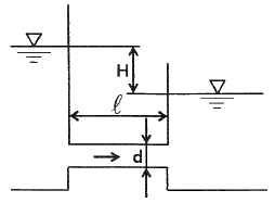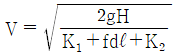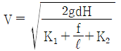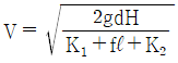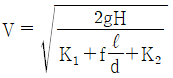수면의 차이가 H인 두 저수지 사이에 지름 d, 길이 ℓ인 관로가 연결되어 있을 때 관로에서의 평균 유속(V)을 나타내는 식은? (단, f는 관마찰계수이고, g는 중력가속도이며, K1, K2는 관입구와 출구에서의 부차적 손실계수이다.)