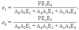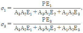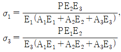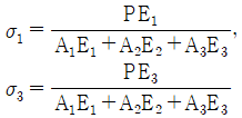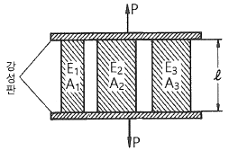 단면적이 각각 A1, A2, A3이고, 탄성계수가 각각 E1, E2, E3인 길이 ℓ인 재료가 강성판 사이에서 인장하중 P를 받아 탄성변형 했을 때 재료 1, 3 내부에 생기는 수직응력은? (단, 2개의 강성판은 항상 수평을 유지한다.)