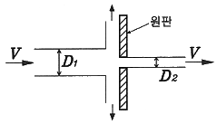 지름 D1=30cm의 원형 물제트가 대기압 상태에서 V의 속도로 중앙부분에 구멍이 뚫린 고정 원판에 충돌하여, 원판 뒤로 지름 D2=10cm의 원형 물제트가 같은 속도로 흘러나가고 있다. 이 원판의 받는 힘이 100N이라면 물제트의 속도 V는 약 몇 m/s 인가?