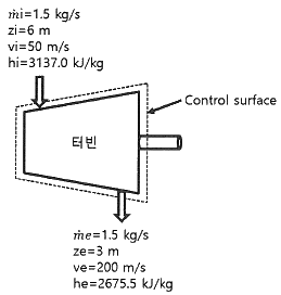 증기터빈에서 질량유량이 1.5kg/s 이고, 열손실률이 8.5kW이다. 터빈으로 출입하는 수증기에 대한 값은 아래 그림과 같다면 터빈의 출력은 약 몇 kW 인가?