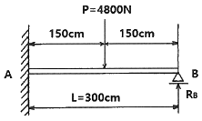 그림과 같은 일단고정 타단지지보의 중앙에 P=4800N의 하중이 작용하면 지지점의 반력(RB)은 약 몇 kN인가?