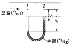 그림과 같이 오일이 흐르는 수평관 사이로 두 지점의 압력차 p1-p2를 측정하기 위하여 오리피스와 수은을 넣어 U자관을 설치하였다. p1-p2로 옳은 것은? (단, 오일의 비중량은 γoil이며, 수은의 비중량은 γHg이다.)