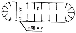끝이 닫혀있는 얇은 벽의 둥근 원통형 압력용기에 내압 p가 작용한다. 용기의 벽의 안쪽 표면 응력상태에서 일어나는 절대 최대 전단응력을 구하면? (단, 탱크의 반경 = r, 벽 두께 = t 이다.)