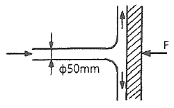 그림과 같이 비중이 0.83인 기름이 12m/s의 속도로 수직 고정평판에 직각으로 부딪치고 있다. 판에 작용되는 힘 F는 약 몇 N인가?