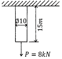 길이 15m, 봉의 지름 10mm인 강봉에 P = 8 kN을 작용시킬 때 이 봉의 길이방향 변형량은 약 몇 mm인가? (단, 이 재료의 세로탄성계수는 210 GPa 이다.)