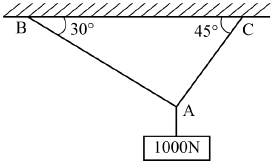 그림과 같은 구조물에 1000N의 물체가 매달려 있을 때 두 개의 강선 AB와 AC에 작용하는 힘의 크기는 약 몇 N인가?