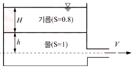 다음 그림에서 벽 구멍을 통해 분사되는 물의 속도(V)는? (단, 그림에서 S는 비중을 나타낸다.)