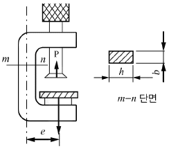 그림에서 클램프(clamp)의 압축력이 P=5kN일 때 m-n 단면의 최소두께 h를 구하면 약 몇 cm인가? (단, 직사각형 단면의 폭 b=10mm, 편심거리 e=50mm, 재료의 허용응력 σω=200MPa이다.)