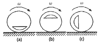 다음 그림과 같이 일부가 천공된 불균형 바퀴가 미끄러짐 없이 굴러가고 있을 때, 각 경우 중 운동에너지의 크기에 대한 설명으로 옳은 것은? (단, 3가지 모두 각속도 ω는 동일하다.)