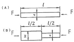 그림과 같이 재료가 동일한 A, B의 원형 단면봉에서 같은 크기의 압축하중 F를 받고 있다. 응력은 각 단면에서 균일하게 분포된다고 할 때 저장되는 탄성 변형 에너지의 비 UB/UA는 얼마가 되겠는가?