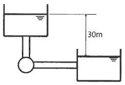그림과 같이 매우 큰 두 저수지 사이에 터빈이 설치되어 동력을 발생시키고 있다. 물이 흐르는 유량은 50m3/min이고, 배관의 마찰손실수두는 5m, 터빈의 작동효율이 90%일 때 터빈에서 얻을 수 있는 동력은 약 몇 kW인가?