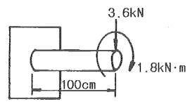 그림과 같이 지름 10cm의 원형 단면보 끝단에 3.6kN의 하중을 가하고 동시에 1.8kN·m의 비틀림 모멘트를 작용시킬 때 고정단에 생기는 최대전단응력은 약 몇 MPa인가?