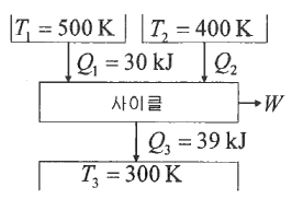 다음의 열기관이 열역학 제1법칙과 제2법칙을 만족하면서 출력일(W)이 최대가 될 때, W의 값으로 옳은 것은? (단, T는 온도, Q는 열량을 나타낸다.)