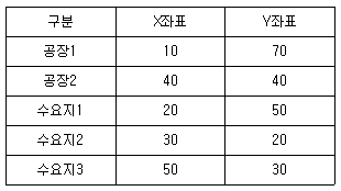 다음 표는 A회사의 공장들과 주요 수요지들의 위치좌표를 나타낸 것이다. 수요지1의 월별 수요는 200톤이며 수요지2의 월별 수요는 300톤, 수요지3의 월별 수요는 200톤이다. 공장1의 월별 공급량은 200톤이며 공장2의 월별 공급량은 500톤이다. 새롭게 건설할 A회사 물류센터의 최적 입지좌표를 무게 중심법으로 구하라. (단, 소수점 둘째자리에서 반올림함)