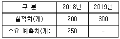 완성품 배송센터의 규모를 결정하기 위한 목적으로 보관 품목의 2020년 수요를 예측하고자 한다. 2018년 수요 예측치와 실적치, 2019년 실적치가 아래의 표와 같다고 가정할 때, 평활상수(α) 0.4인 지수평활법을 활용한 2020년의 수요 예측치는?
