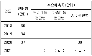 다음은 L사의 연도별 휴대전화 판매량을 나타낸 것이다. 2021년 휴대전화 수요를 예측한 값으로 옳은 것은? (단, 단순이동평균법의 경우 이동기간(n)은 3년 적용, 가중이동평균법의 경우 가중치는 최근 연도로부터 0.5, 0.3, 0.2 을 적용, 지수평활법의 경우 평활상수(α)는 0.4를 적용, 모든 예측치는 소수점 둘째자리에서 반올림한다.)