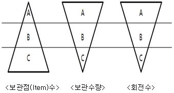 시중에서 유통되는 '콜라'의 물류특성(보관점수는 적고, 보관수량과 회전수는 많음)을 아래 그림의 보관유형으로 나타낼 때 순서대로 옳게 나타낸 것은?