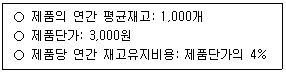 A제품을 취급하는 K물류센터의 정보가 아래와 같을 때, 이 물류센터의 연간재고유지비용(원)은? (단, 재고 보충은 없으며, 수요는 일정하다.)