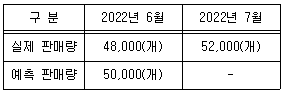 A상품의 2022년도 6월의 실제 판매량과 예측 판매량, 7월의 실제 판매량 자료가 아래 표와 같을 때 지수평활법을 활용한 8월의 예측 판매량(개)은? (단, 평활상수(α)는 0.4를 적용한다.)