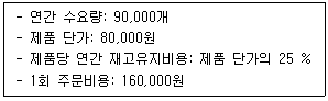 제품 B를 취급하는 K물류센터는 경제적 주문량(EOQ)에 따라 재고를 관리하고 있다. 재고관리에 관한 자료가 아래와 같을 때 (ㄱ)연간 총 재고비용과 (ㄴ)연간 발주횟수는 각각 얼마인가? (단, 총 재고비용은 재고유지비용과 주문비용만을 고려한다.)
