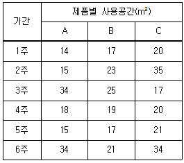 3개의 제품(A~C)을 취급하는 1개의 창고에서 기간별 사용공간이 다음 표와 같다. (ㄱ)임의위치저장(Randomized Storage)방식과 (ㄴ)지정위치저장(Dedicated Storage)방식으로 각각 산정된 창고의 저장소요공간(m2)은?