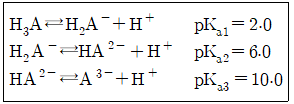 어떤 삼양성자산(tripotic acid)이 수용액에서 다음과 같은 평형을 가질 때 pH9.0에서 가장 많이 존재하는 화학종은?