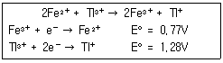 0.1M 의 Fe2+ 50mL를 0.1M 의 Tl3+ 로 적정한다. 반응식과 각각의 표준환원전위가 다음과 같을 때 당량점에서 전위(V)는 얼마인가?