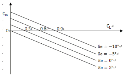그림과 같이 피칭모멘트계수(Cm)-양력계수(CL) 선도를 갖는 항공기에서 현재속도 200knot에서 승강 키의 각이 δe=0° 로 트림되어 있다면 이를 δe=−5°인 수평등속비행으로 트림시키면 속도는 약 몇 knot로 되는가?